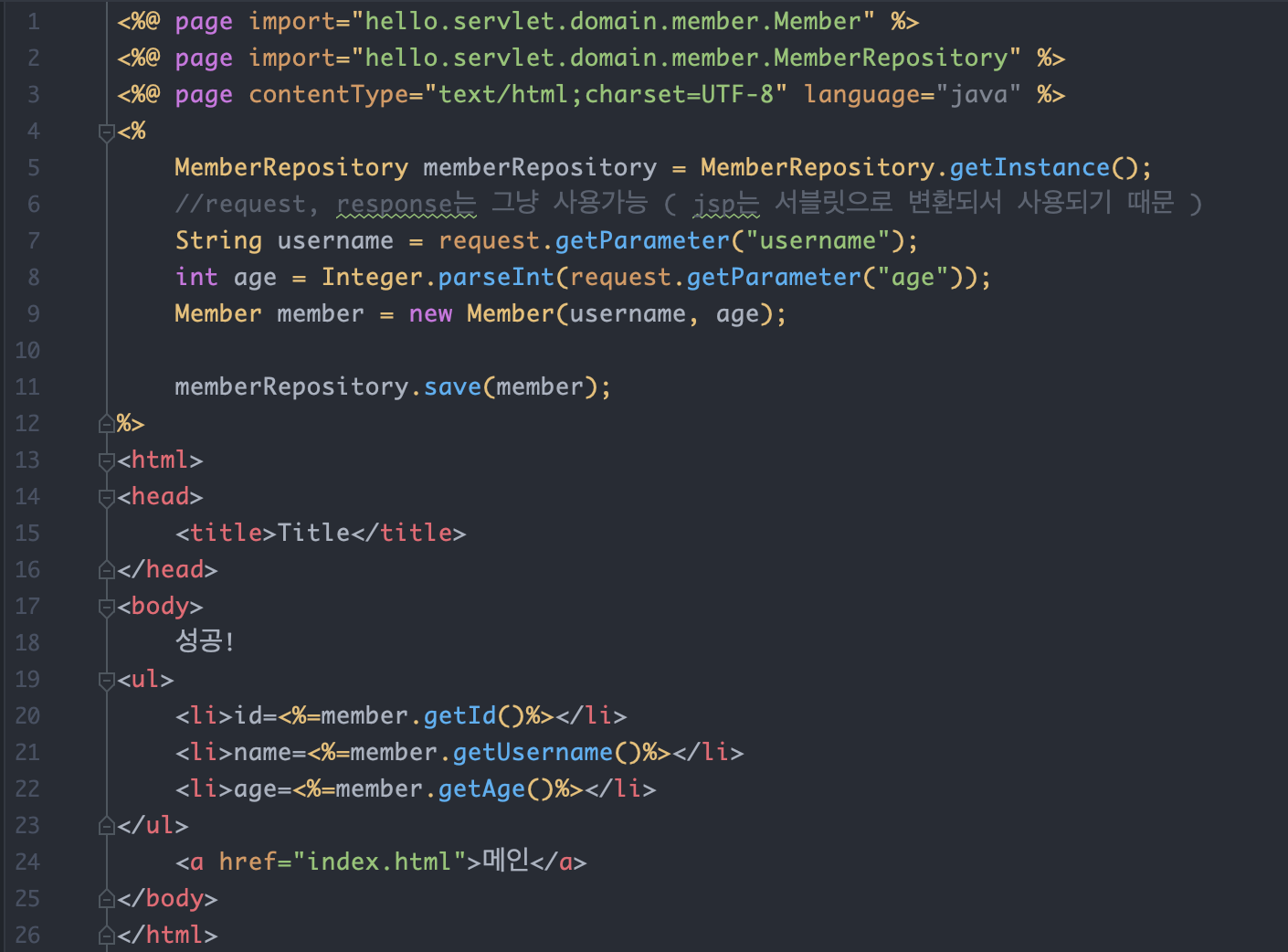 그런데 회원 저장 JSP를 보면 코드의 상위 절반은 회원을 저장하기 위한 비즈니스 로직이고, 나머지 하위 절반만 결과를 HTML로 보여주기 위한 뷰 영역입니다. 회원 목록의 경우에도 마찬가지입니다.