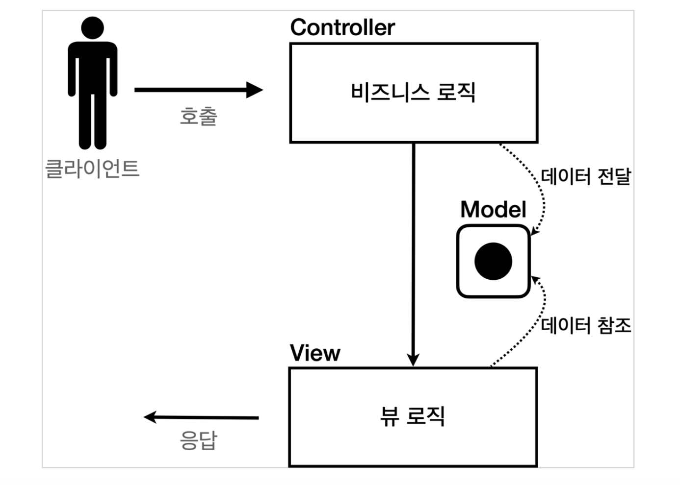 모델: 뷰에 출력할 데이터를 담아둡니다. 뷰가 필요한 데이터를 모두 모델에 담아서 전달해주는 덕분에 뷰는 비즈니스 로직이나 데이터 접근을 몰라도 되고, 화면을 렌더링 하는 일에 집중할 수 있습니다.