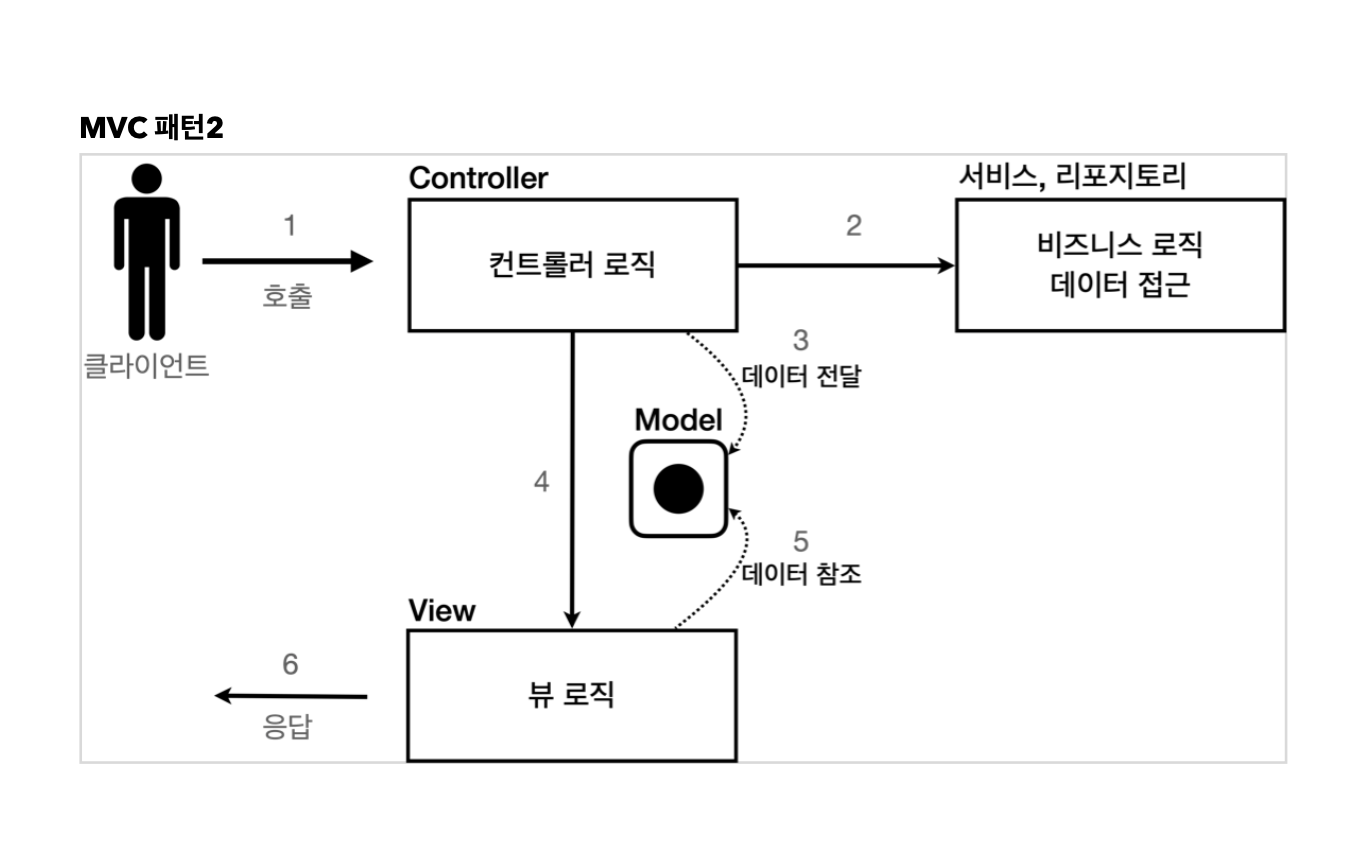 MVC 패턴은 지금까지 학습한 것처럼 하나의 서블릿이나, JSP로 처리하던 것을 컨트롤러(Controller)와 뷰(View)라는 영역으로 서로 역할을 나눈 것을 말합니다. 웹 애플리케이션은 보통 이 MVC 패턴을 사용합니다.