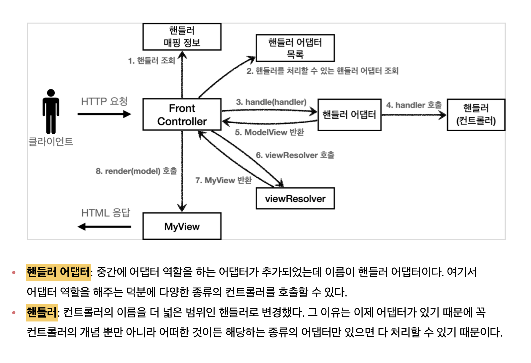 이전에는 컨트롤러를 직접 매핑해서 사용했습니다. 그런데 이제는 어댑터를 사용하기 때문에, 컨트롤러 뿐만 아니라 어댑터가 지원하기만 하면, 어떤 것이라도 URL에 매핑해서 사용할 수 있습니다. 그래서 이름을 컨트롤러에서 더 넒은 범위의 핸들러로 변경했습니다.
