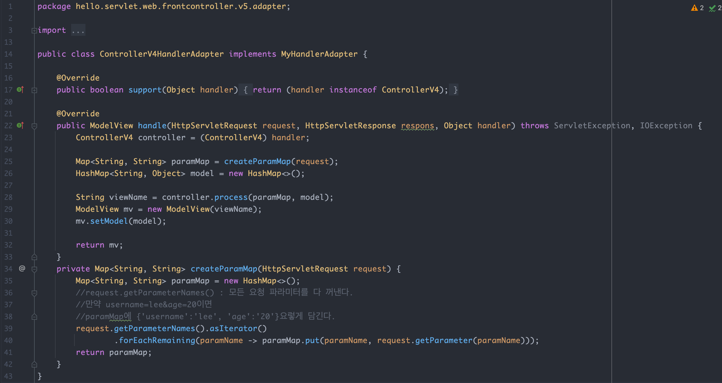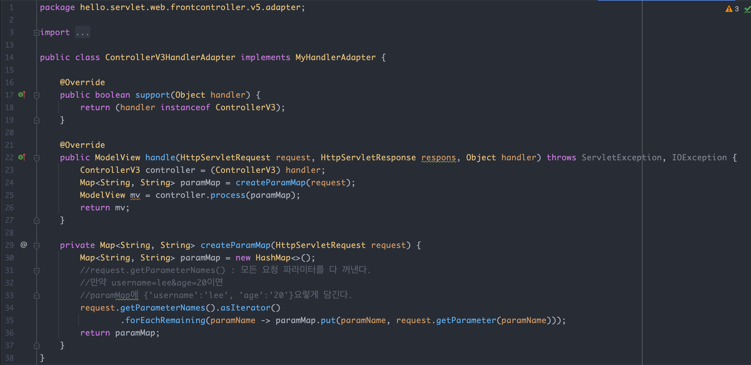 어댑터는 handler(컨트롤러)를 호출하고 그 결과를 어댑터에 맞추어 반환합니다. ControllerV3HandlerAdapter 의 경우 어댑터의 모양과 컨트롤러의 모양이 유사해서 변환 로직이 단순합니다.