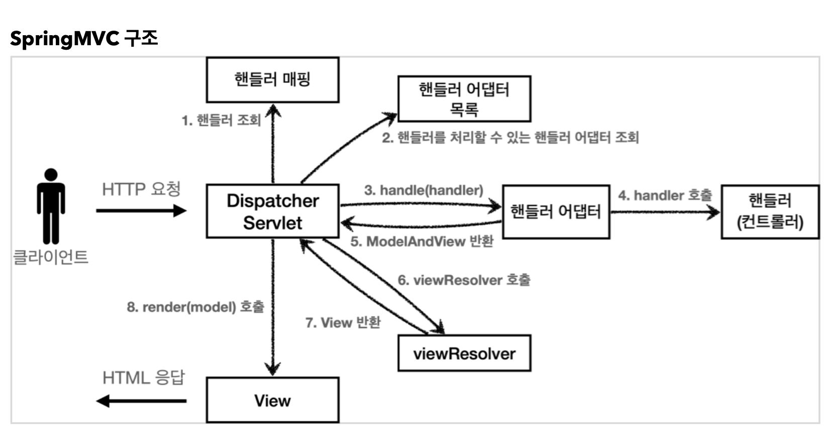 - ModelAndView 반환: 핸들러 어댑터는 핸들러가 반환하는 정보를 ModelAndView로 변환해서 반환한다.