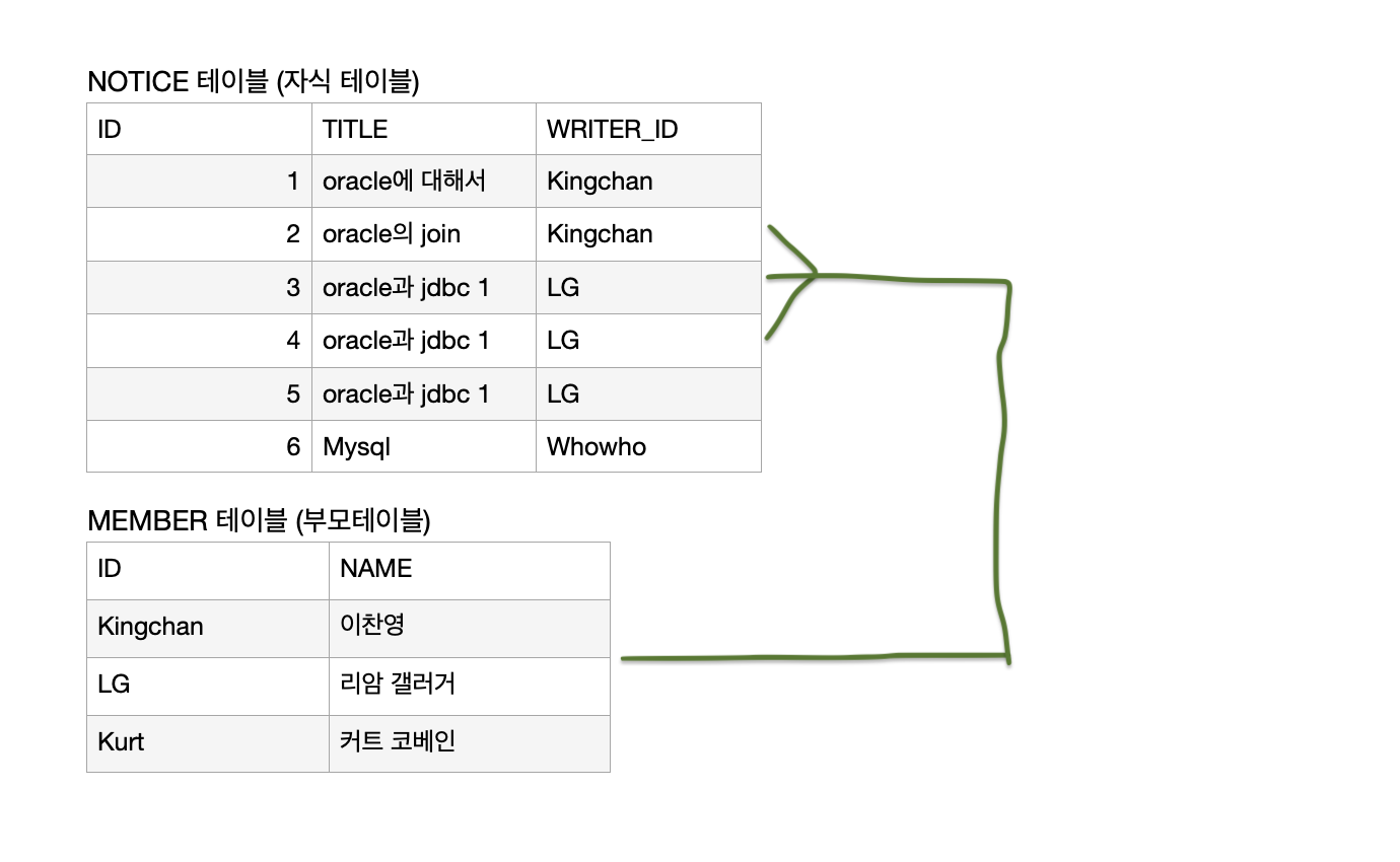MEMBER 테이블과 게시글 테이블인 NOTICE 테이블을 예로 보자.