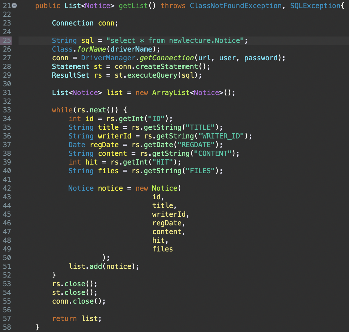 getList함수는 DB에 요청한 정보를 Notice타입 List에 받는다.