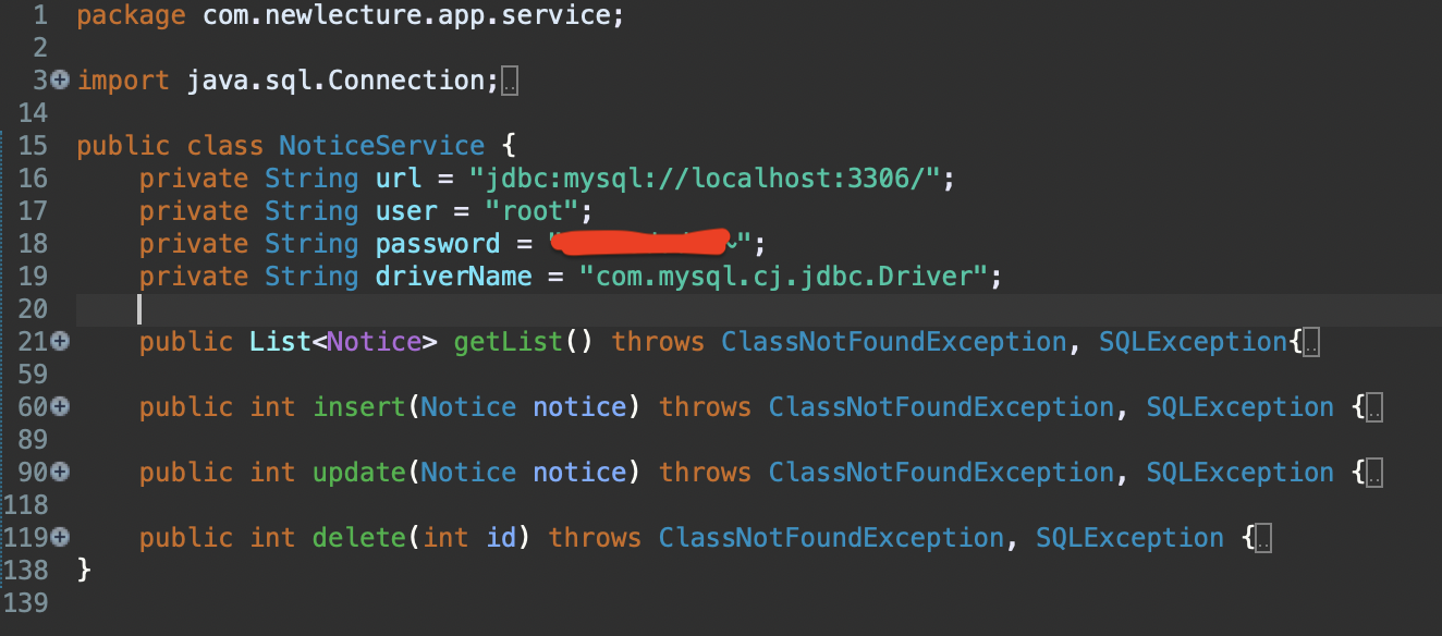 여기는 Notice에 관한 CRUD기능을 모두 옮겨 놓은 것이다. 전 포스팅에서 각각 SELECT, INSERT, UPDATE, DELETE하는 클래스들의 코드를 봤는데 그것들을 하나의 클래스에 서비스로 모아둔 것이다.