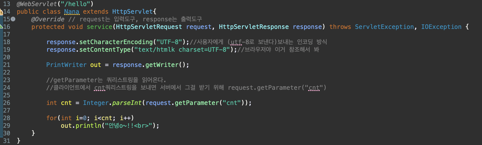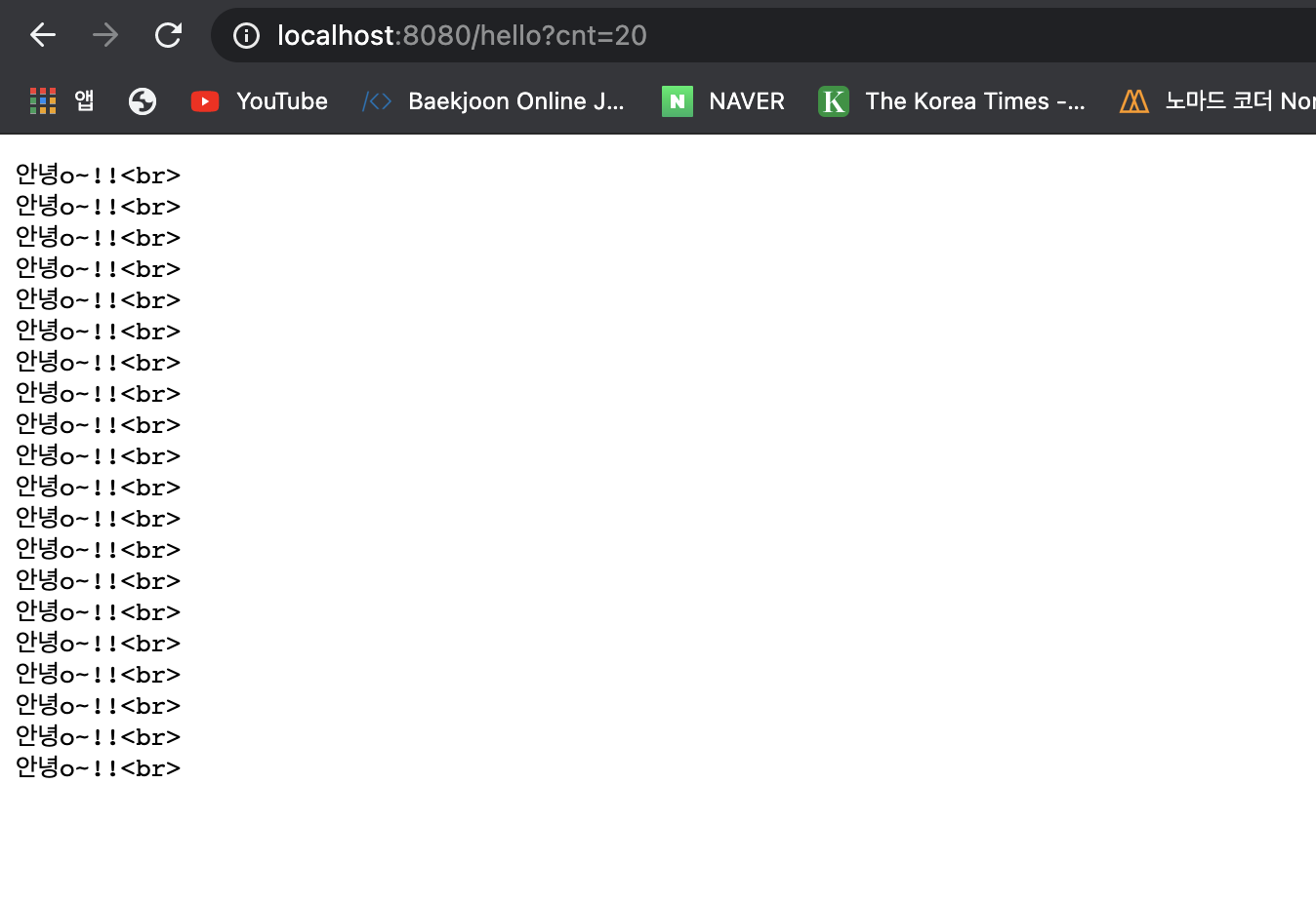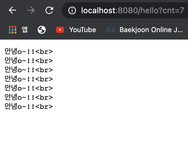 즉 사용자가 쿼리스트링으로 hello?cnt=7을 날리면 7번만 반복문을 수행하도록 하는 것이다.