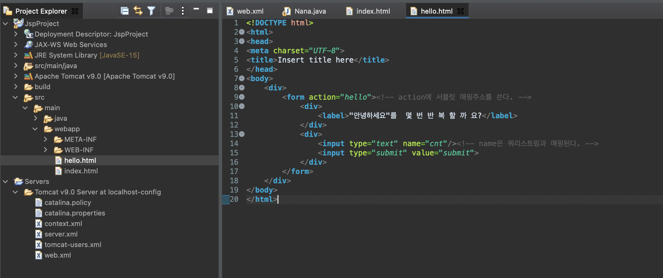 이제는 html파일을 사용하여 더 그럴듯하게 출력횟수를 입력받아 보자. 다음과 같이 webapp디렉토리 아래에 hello.html이라는 파일을 만들고 다음의 코드들을 적는다.