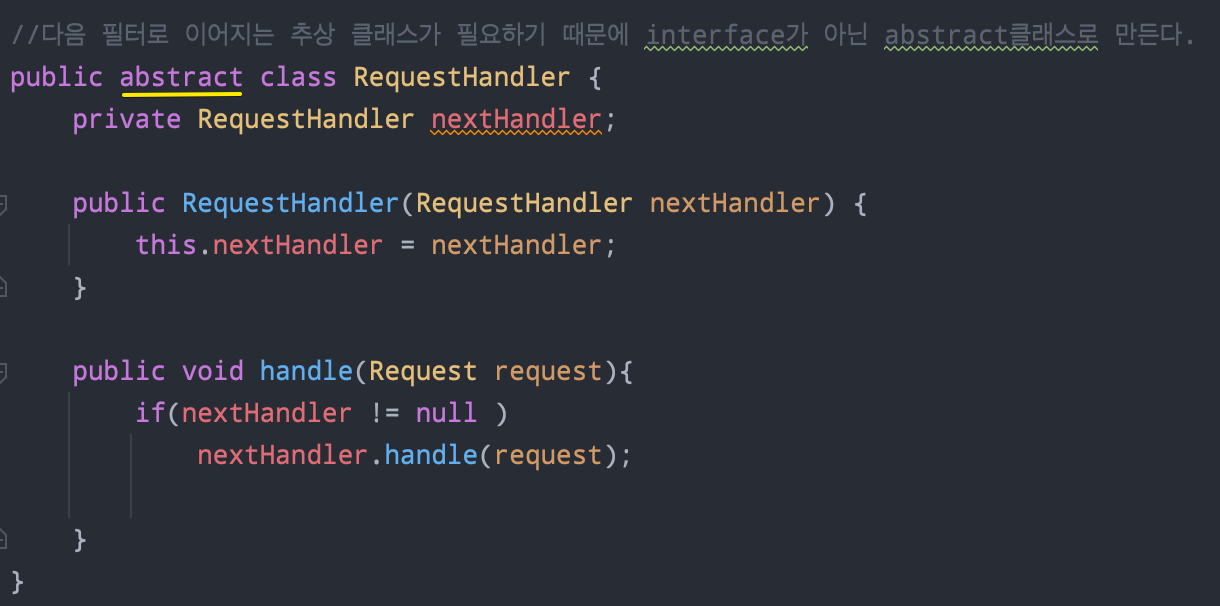 먼저 클래스 다이어그램에서 본 Handler 추상타입 클래스를 만들어야한다, 우리는 abstract 클래스로 만들어서 해당 클래스가 nextFilter를 참조 하도록 만들 것이다.