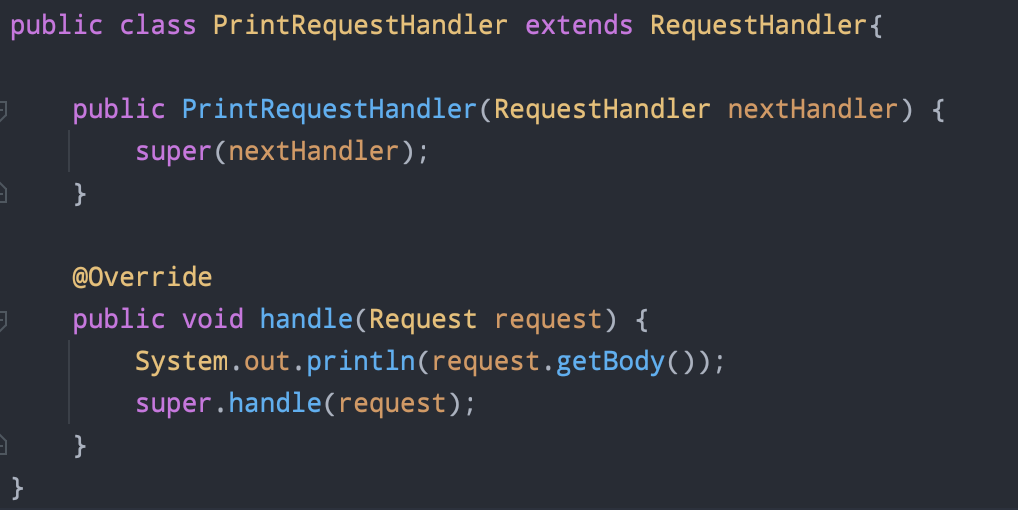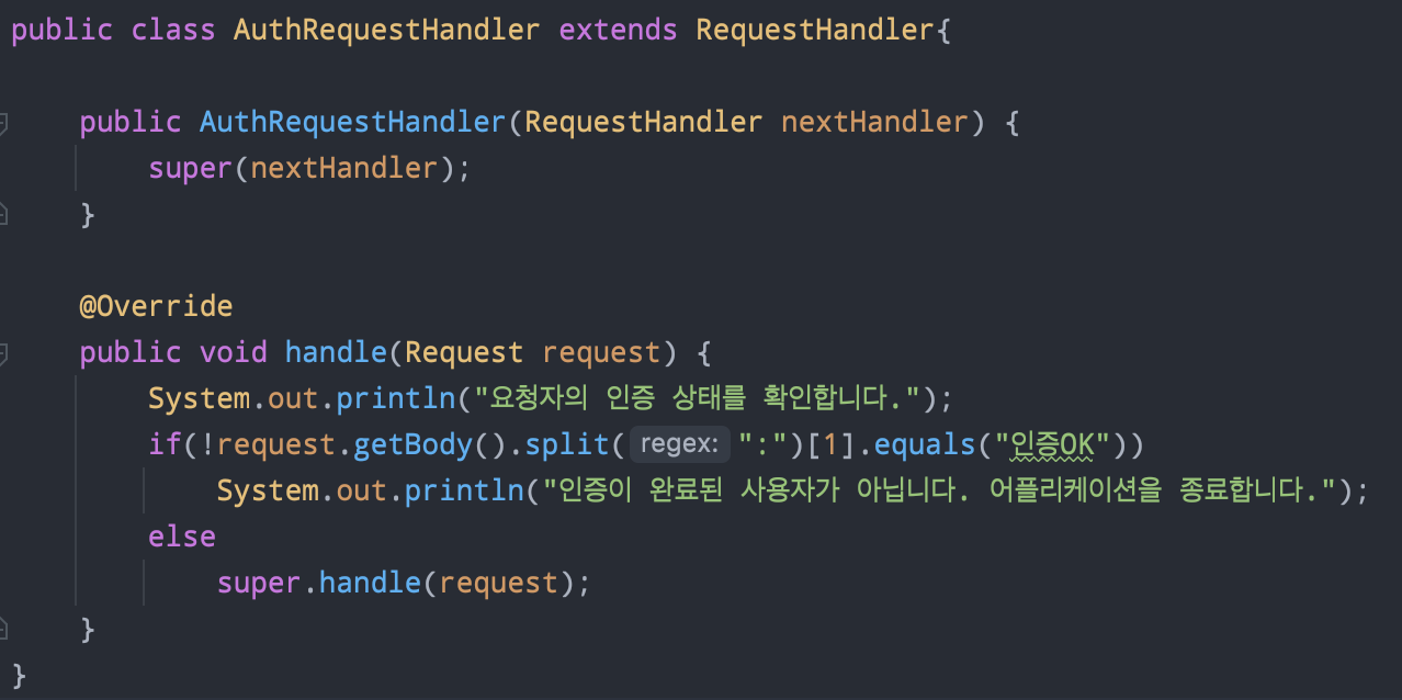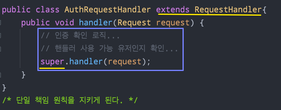 그리고 위에서 보이듯이 자신은 handler메소드를 통해 인증 관련 로직을 하고난 뒤, super로 원래의 Handler로직을 RequestHandler에게 맡기는 것이다. 이렇게 구현하면 SRP도 지키면서 인증 관련 로직을 추가할 수 있다.