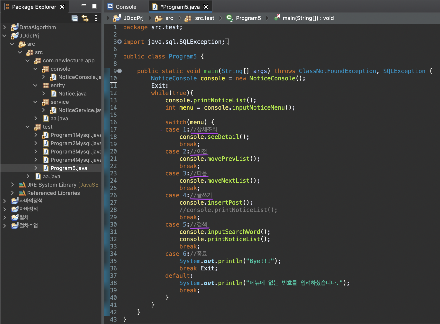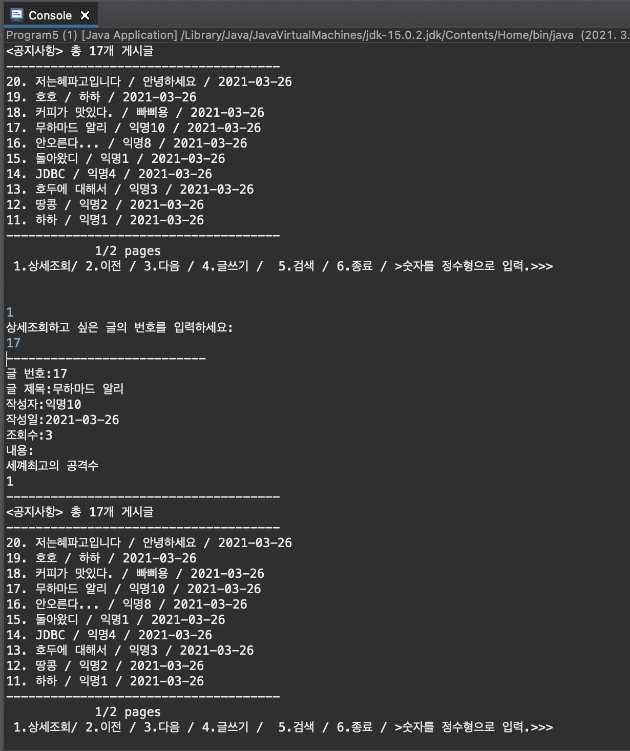 만들던 jdbc콘솔 게시판 프로그램에 기능을 추가하였다.