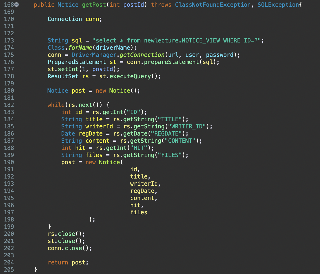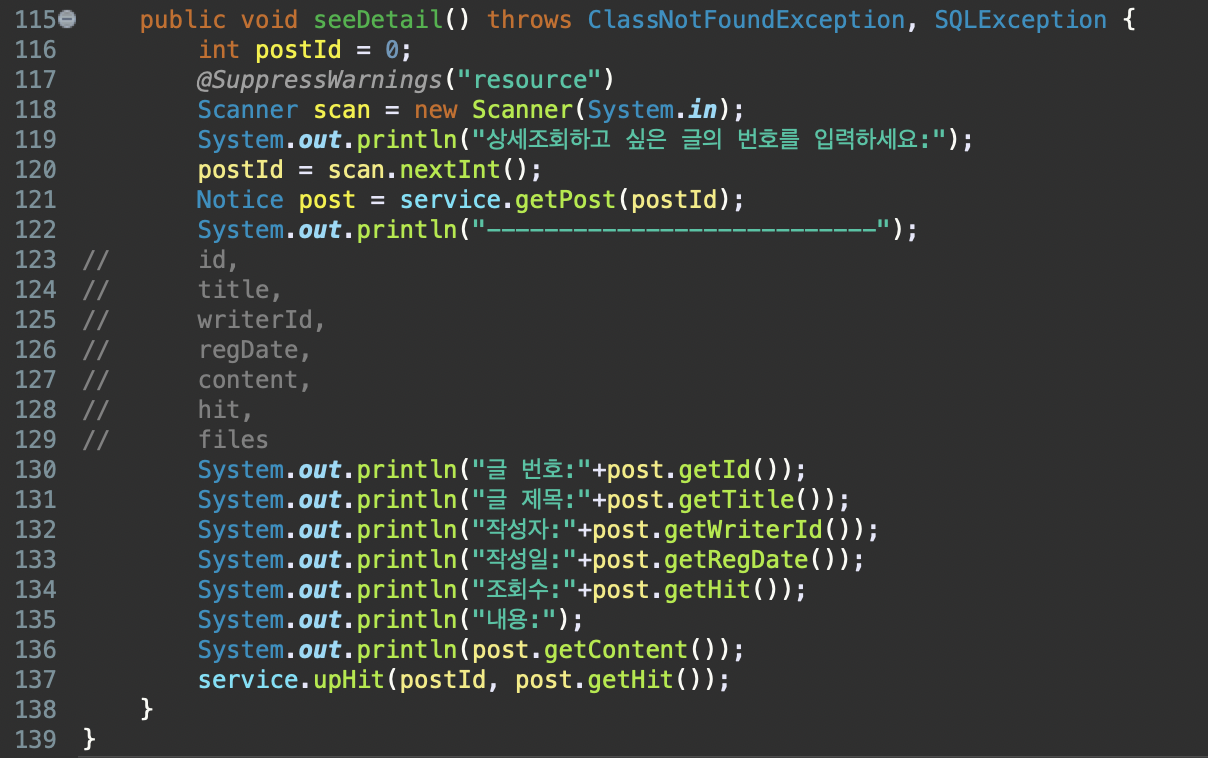 그렇게 되면 db에 id값으로 가져온 데이터를 기반으로 Notice 객체를 만들고 이 객체를 반환해 주면 NoticeConsole의 seeDetail메소드가 출력해준다.
