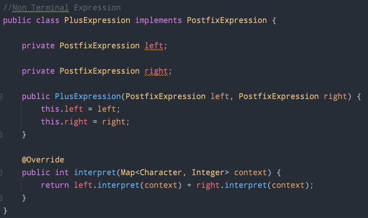 하지만 "+-"과 같은 Expression은 다른 두개의 Expression을 interpret한 다음 그 결과를 연산하는 Non Termianl Expression이다.