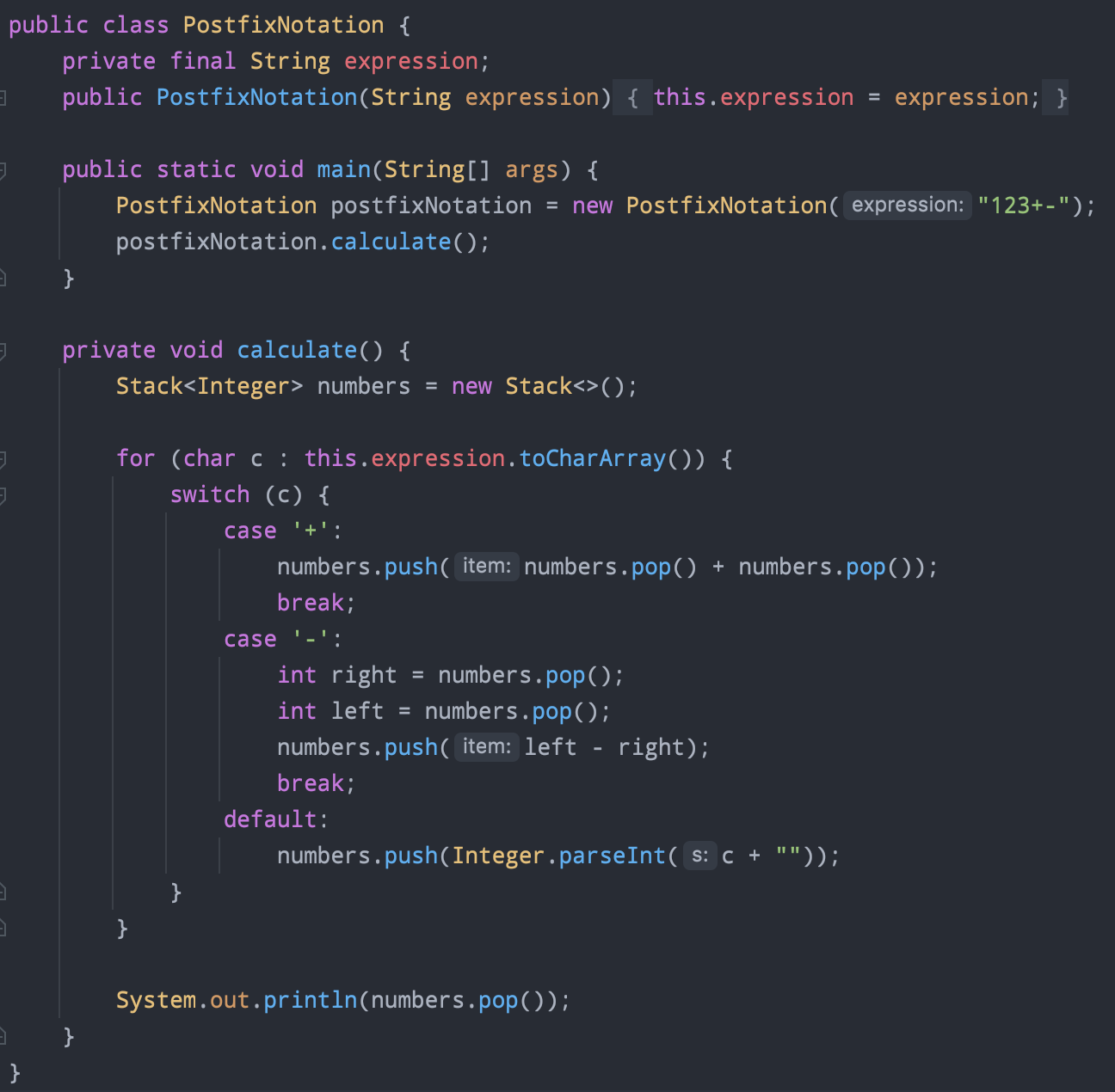 후위연산을 하는 코드가 있다고 하자. ( 후위연산 예 : "123+-" ➡️ "1 - 2 + 3"와 같다. )