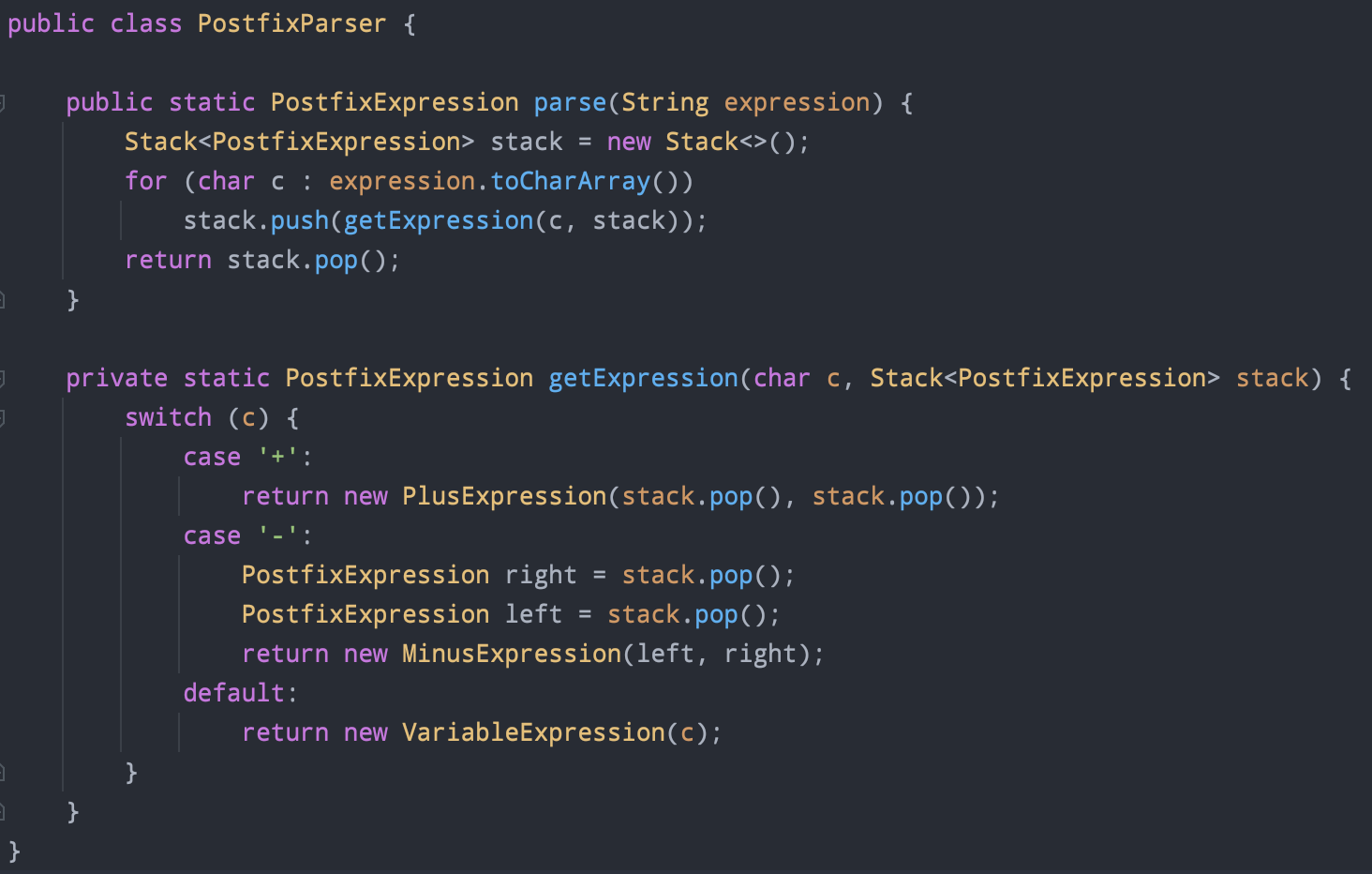 parse메소드를 보면 받은 문자열을 character타입으로 나눈뒤, getExpression메소드를 사용하여 stack에 넣어준다.
