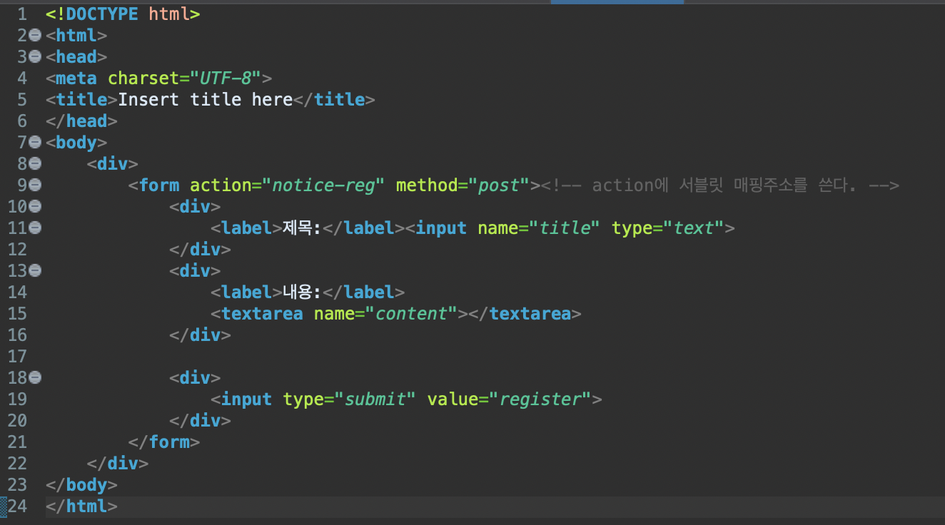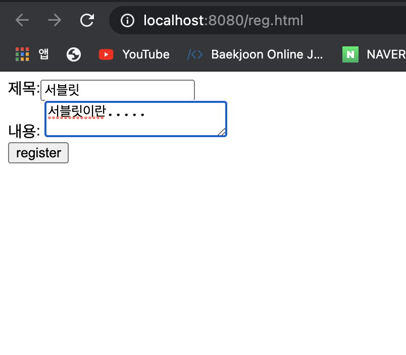 내용을 입력하고 여기서 이제 등록을 누르면 서블릿에 매핑된 주소 notice-reg로 데이터를 날린다.