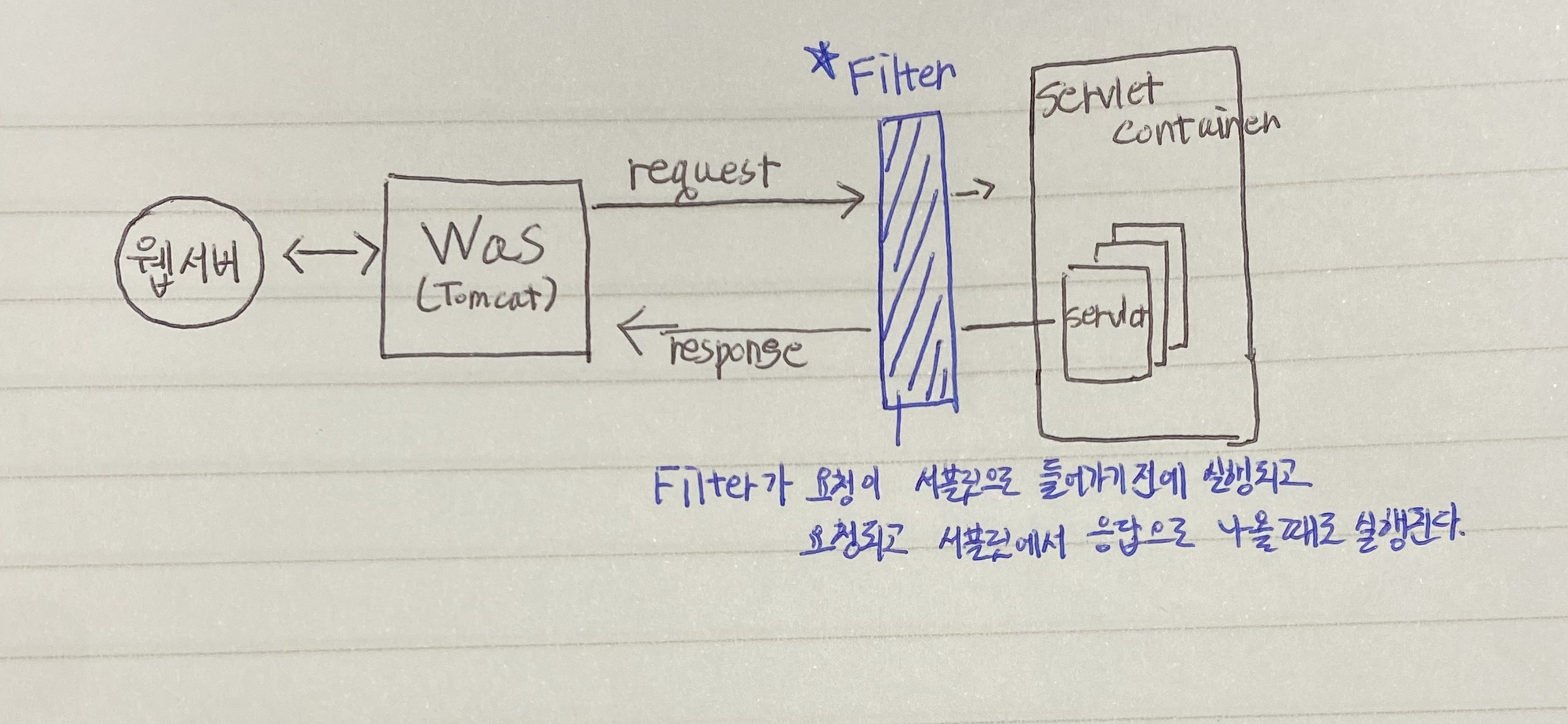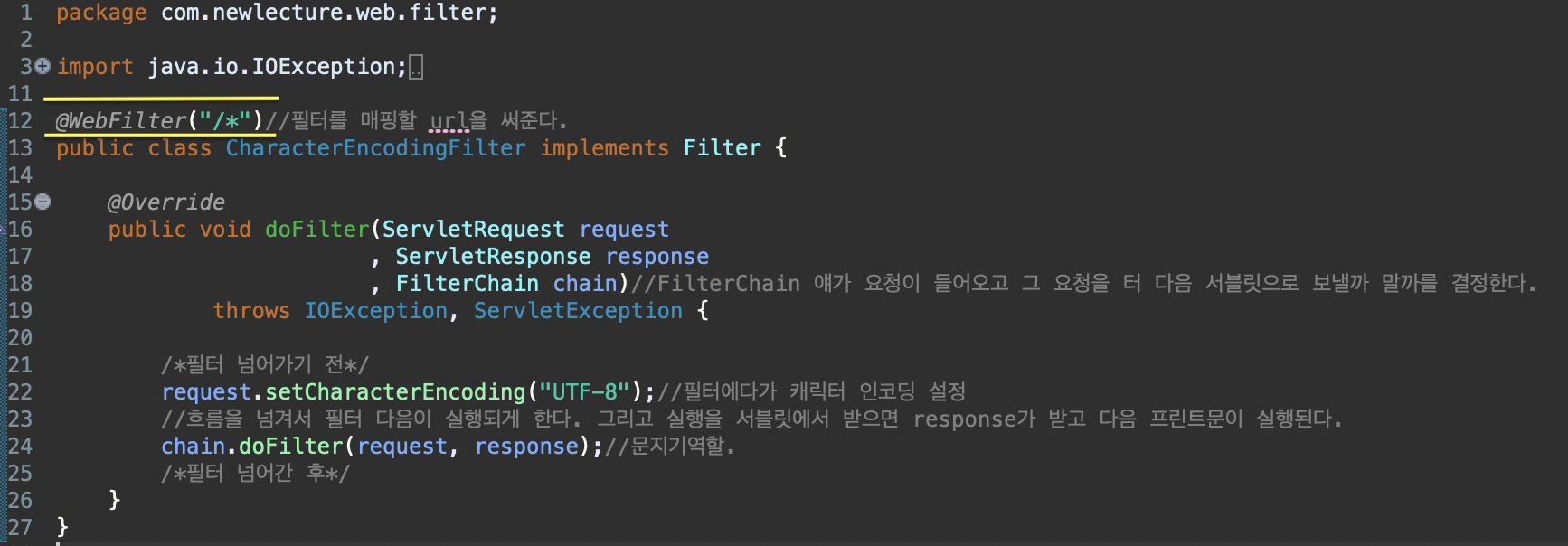 근데 사실 필터라는 것을 설정하면 위의 코드는 없어도 된다. 필터는 요청이 서블릿으로 들어오기 전에 처리기능을 가지고 있다.