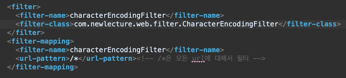 위의 코드를 추가한다. 그렇게되면 네임에 설정된 모든 url(/*)에 대하여 필터가 작동할 것이다.