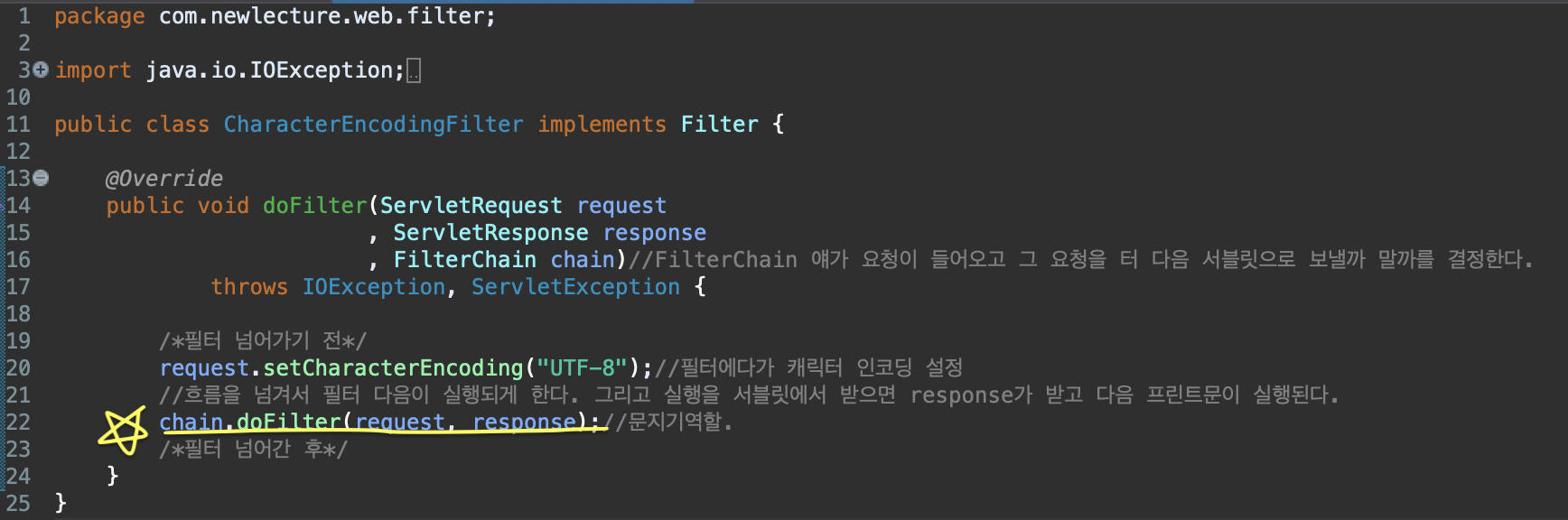 필터 설정 전에 request.setCharacterEncoding("UTF-8");가 있는데 필터로 들어오기 전에! 요청에 대한 인코딩 설정을 하게 하는 것이다.