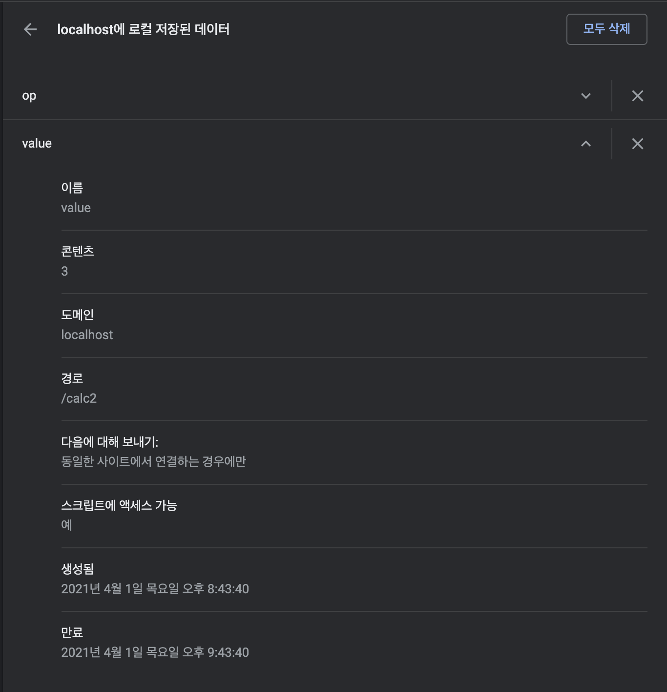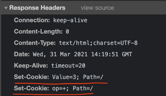이렇게 쿠키를 지정하고 계산기에서 3을 입력하여 (+)을 눌러서 서버로 요청하고, 크롬 설정에서 발급된 쿠키의 정보를 봐보자.