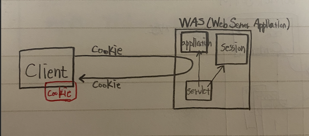 처음에 처음보는 사용자가 요청을 보내면 서버(WAS)에서 예를 들어 세션번호: SID101 를 만들어 줘서 돌려 보낸다. 그렇게 되면 SID101을 가진 사용자는 같은 서버에 또 요청을 보내면 서버는 사용자가 들고있는 SID번호를 확인하고, 해당 seesion저장소에 있는 데이터를 기반으로 로직을 처리하게 된다.