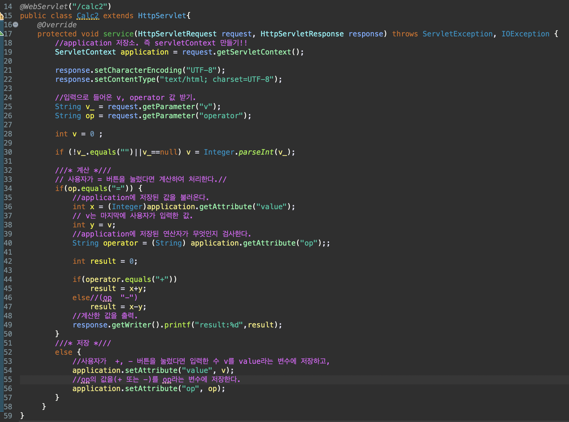 52line이하: application저장소에 "value"라는 이름으로 v(=5)를 저장하고, "op"라는 이름으로 op(="+")를 저장한다.