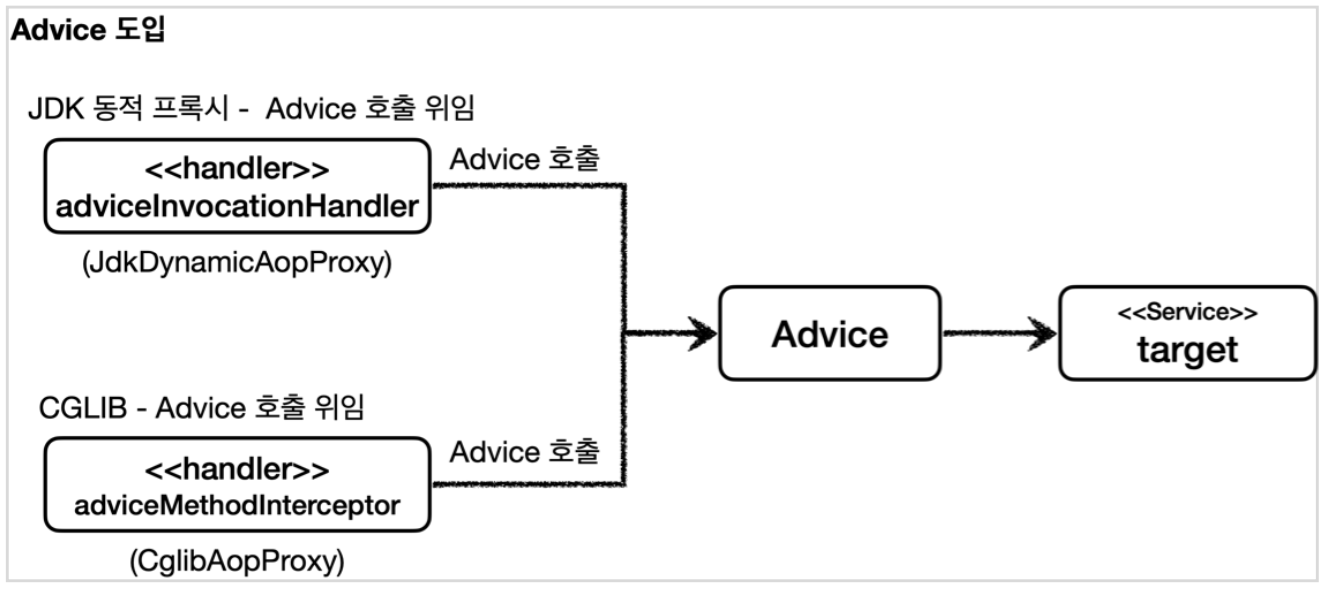개발자가 Advice를 구현하면 스프링이 adviceInvocationHandler 또는 adviceMethodInterceptor를 사용하여 개발자가 구현한 Advice를 호출하도록 해준다.