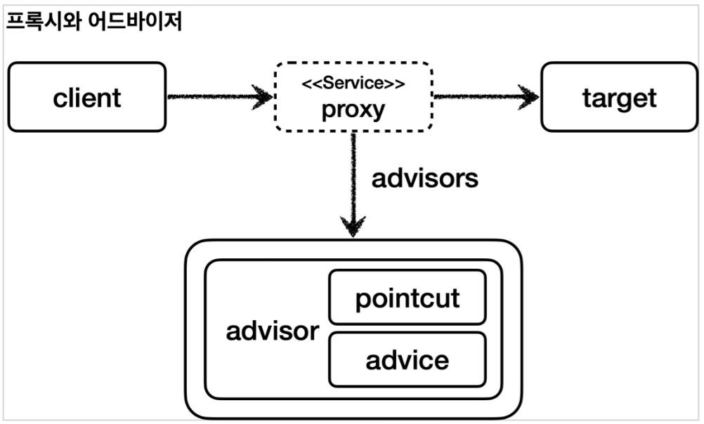 • Advisor 안에는 Pointcut 과 Advice가 이미 모두 포함되어 있다. 따라서 Advisor 만 알고 있으면 그 안에 있는 Pointcut으로 어떤 스프링빈에 프록시를 적용해야 할지 알 수 있다. 그리고 Advice로 부가기능을 적용하면 된다.
