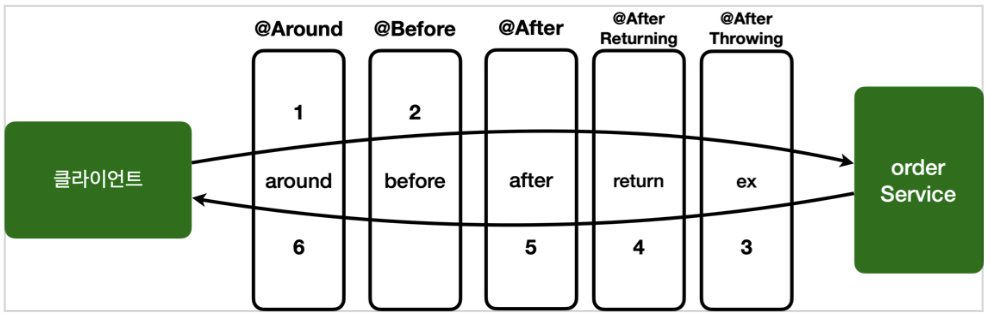 • 실행 순서: @Around , @Before , @After , @AfterReturning , @AfterThrowing