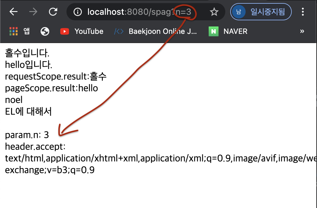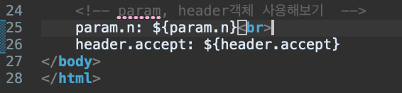 위와 같은 자바 코드가 남아있었다. 뷰에는 완전히 출력만을 하기 위해 jsp는 EL이라는 것을 제공한다.