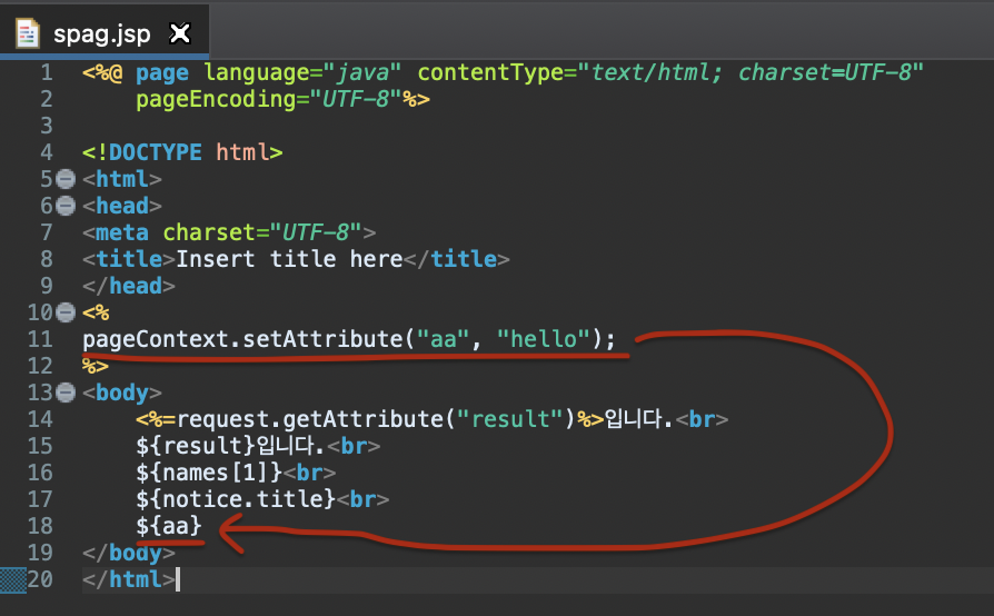 spag.jsp의 11 line의 자바코드가 들어간 것보다. 12번 라인이하는 훨씬 간결하다.