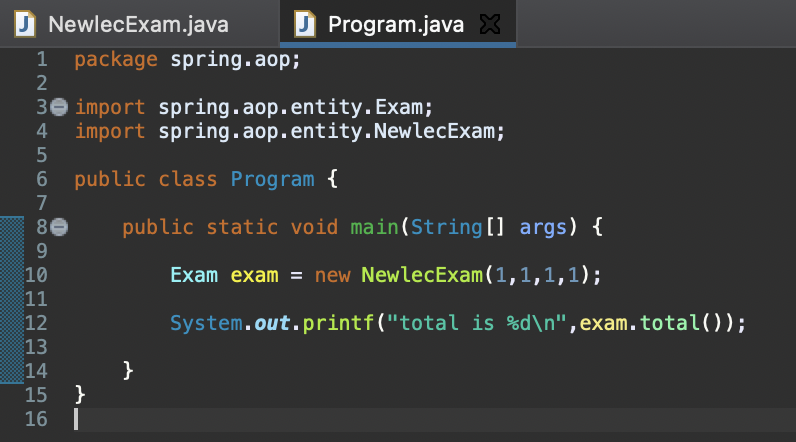 이제 cross-cutting concern을 total()메서드에서 꺼내고 프록시를 사용하여 cross-cutting concern가 core concern을 호출하는 방식으로 코드를 바꿔보자. 이는 실행부인 Program.java에 코드를 추가한다.