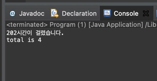 위의 코드에서 주황색 네모 박스가 cross-cutting concern이라 할 수 있다. total()메서드는 원래 총점을 구하고 반환해주는 함수인데 그안에 이 메서드가 수행되는데 시간이 얼마나 걸리는지에 대한 코드가 담겨있다. 즉 core concern과 cross-cutting concern이 하나의 클래스에 있는 것이다. 이를 실행하면 다음과 같다.