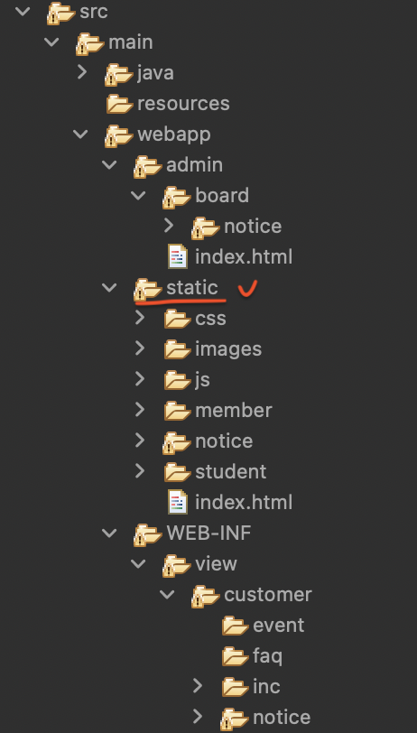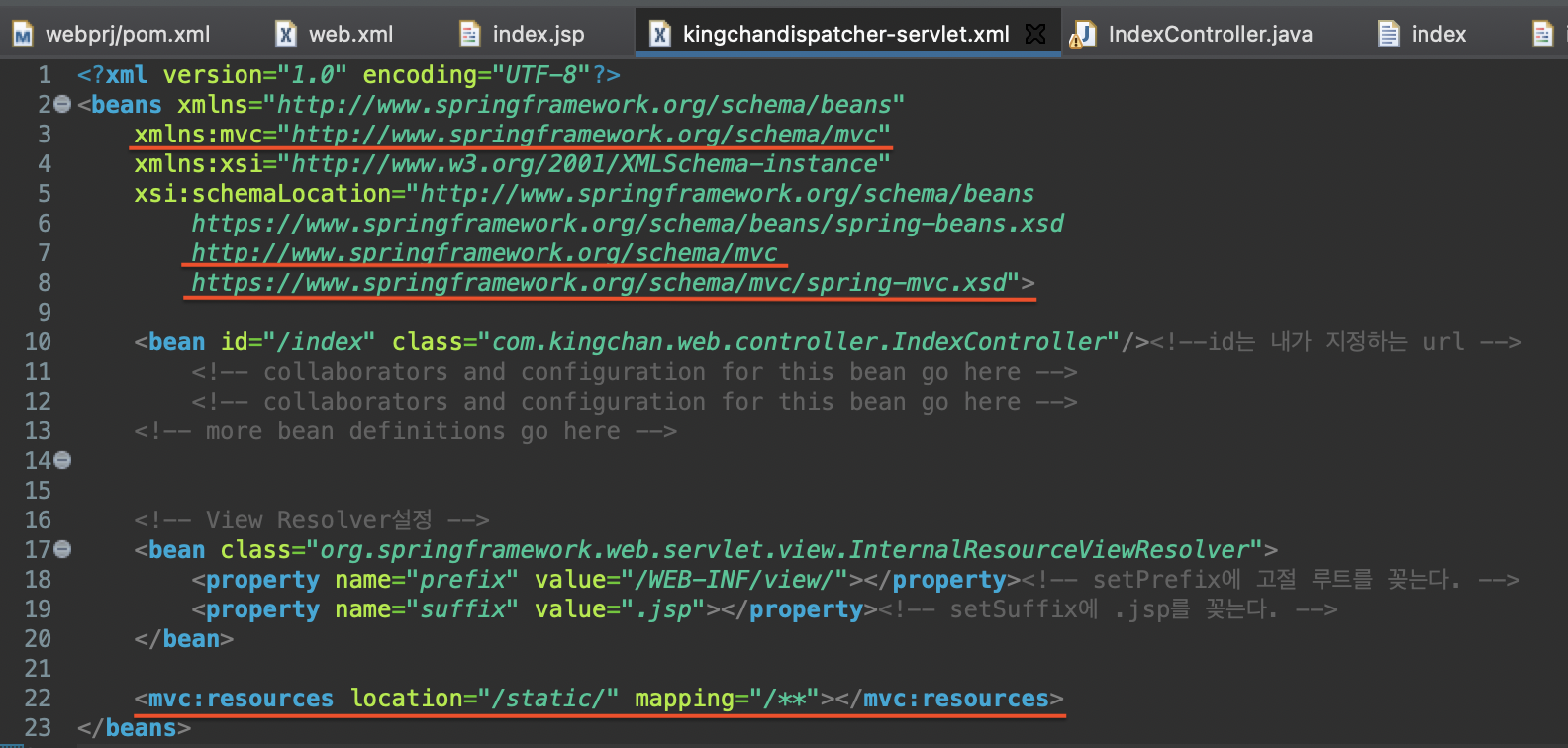 그래서 정적파일들의 서비스를 위해서는 아래와 같이 dispatcher-servlet.xml에 태그들을 추가해야한다.