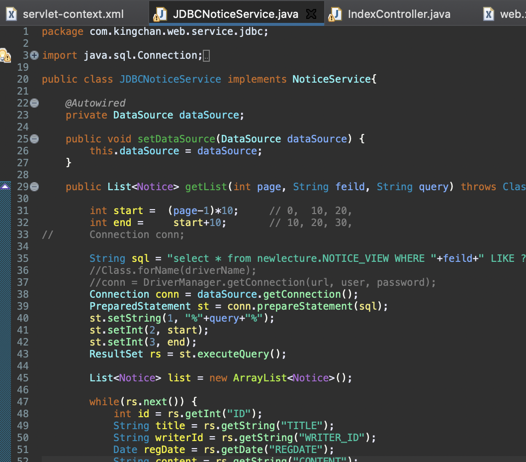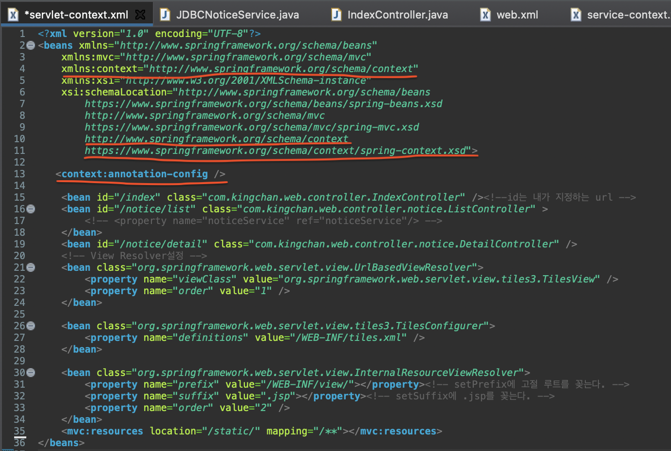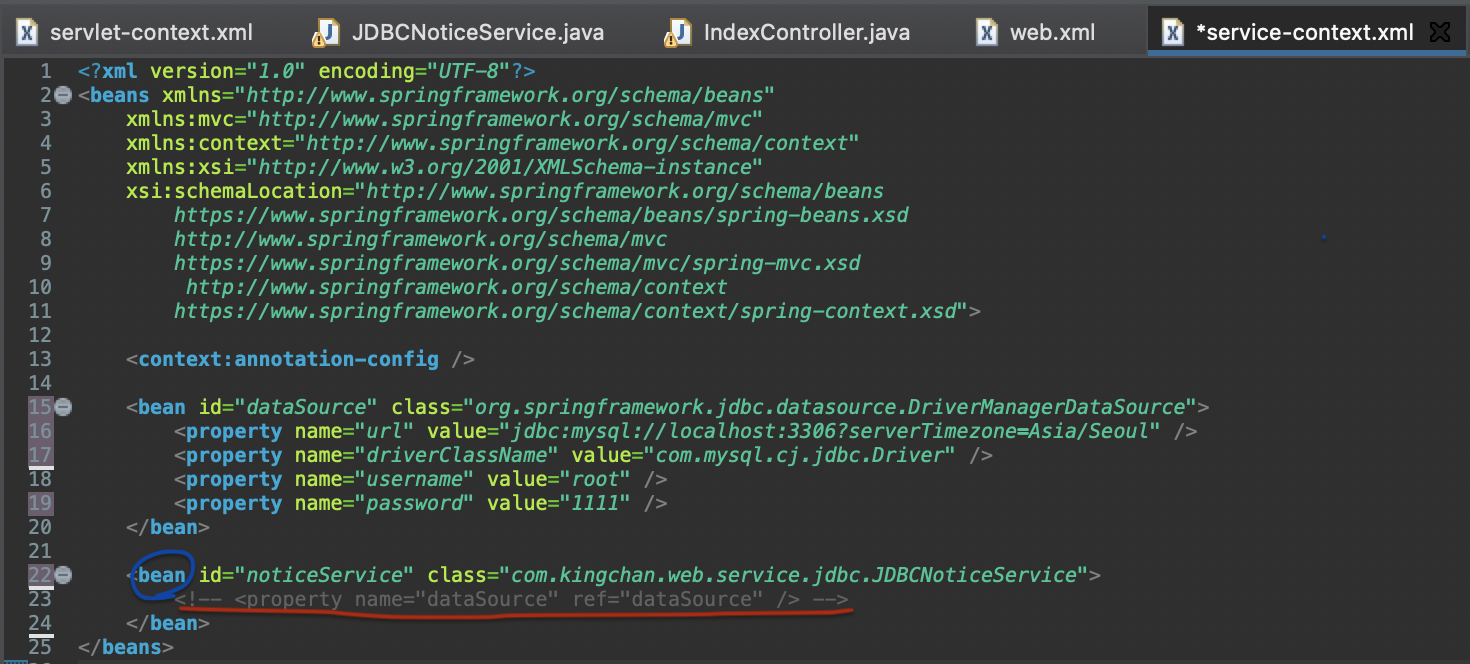 그니까 위에 보이는 NoticeService형 객체 noticeService는 이미 빈 객체가 생성된 것이다. 아래의 service-context.xml파일에서 생성한다.