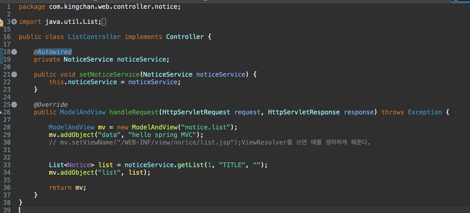 파란색 동그라미가 noticeService를 Bean객체로 만드는 부분이다.