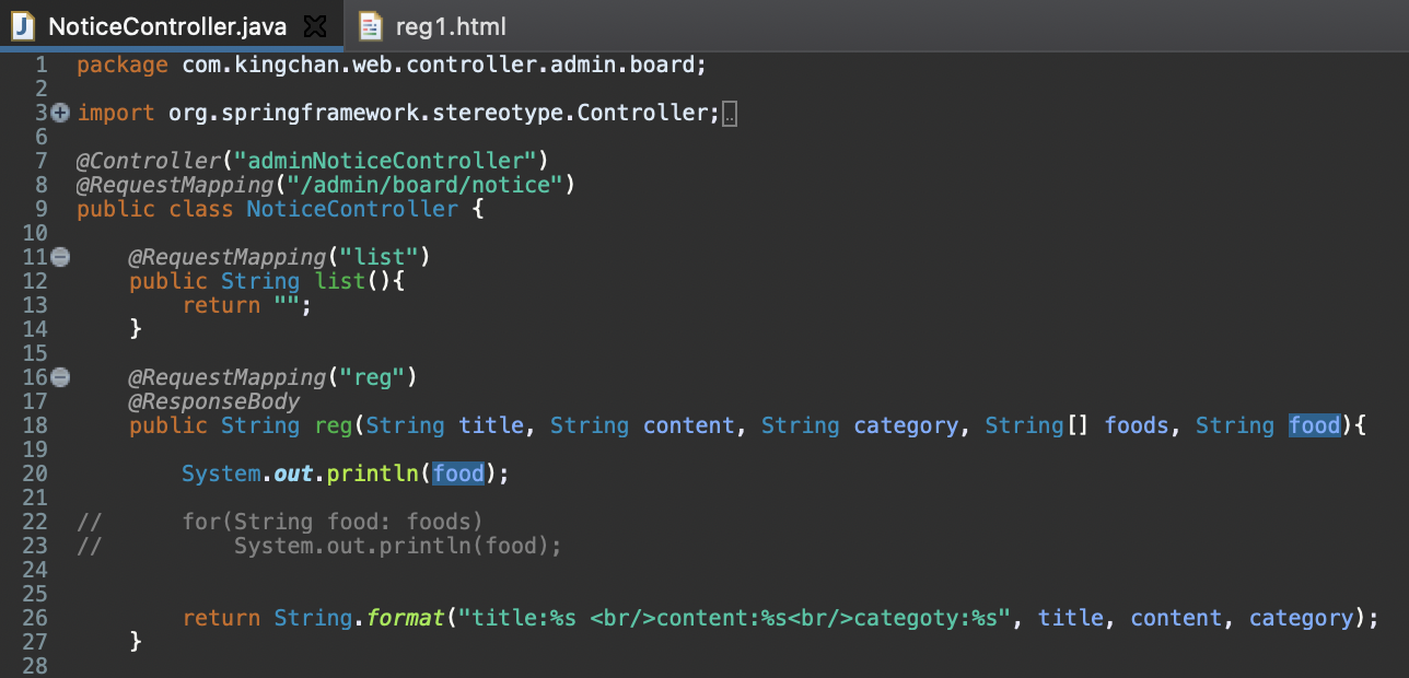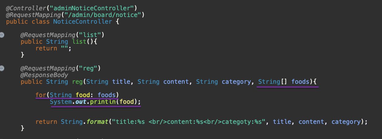 /admin/board/notice/reg에 매핑된 reg메소드를 보면 String[] foods라는 배열로 체크박스 값들을 받고 있다.