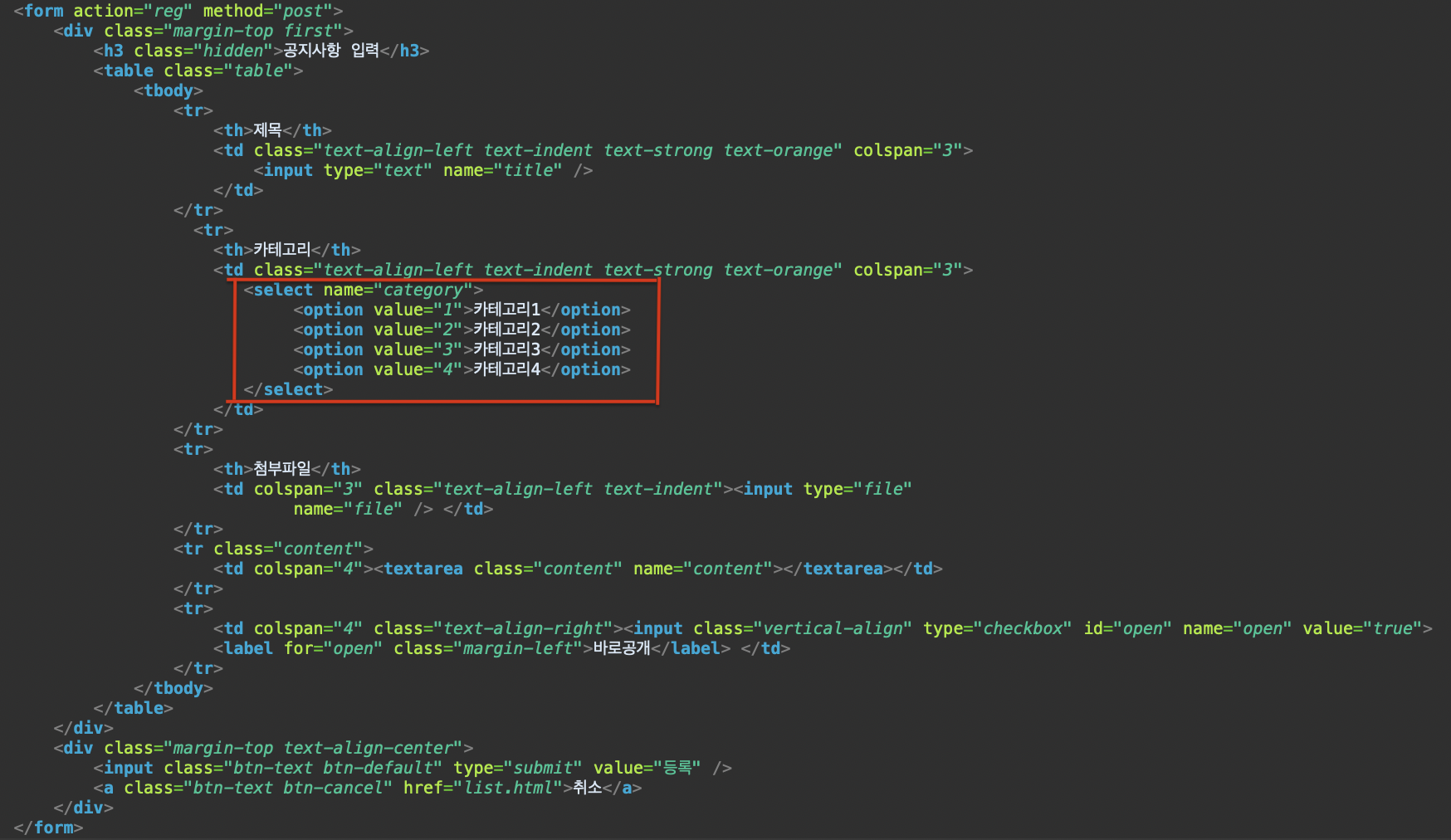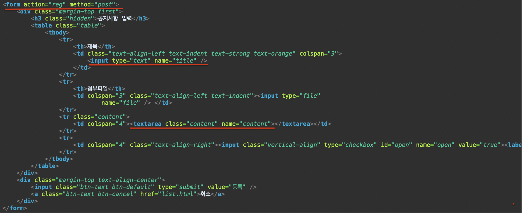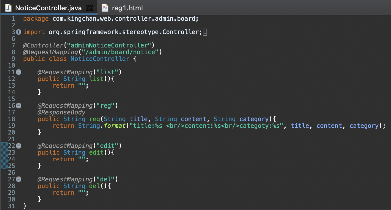 form action = "reg" 에서 보이듯이 위의 화면에서 등록버튼을 누르면 reg로 해당 내용들을 날린다.