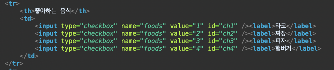위 사진처럼 타코, 피자, 햄버거 3개를 선택하고 등록버튼을 누르면 모두 name="foods"로 같으므로, valuㄷ 값으로 구분해야 한다.