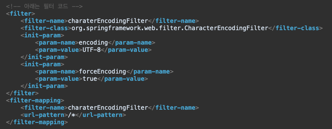 맨 아래쪽에 <url-pattern>/*</url-pattern>으로 해서 모든 url들이 필터를 거치도록 하였다.